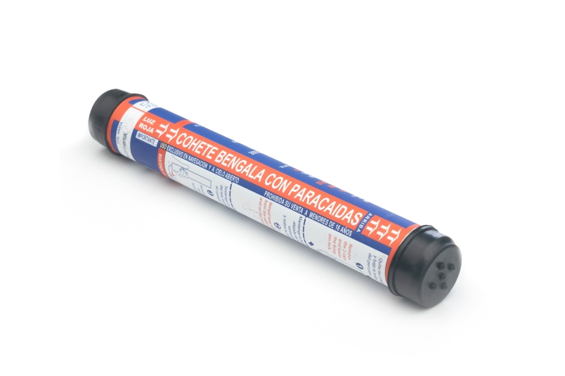 El Cohete Lanza Bengala con Paracaídas es un dispositivo pirotécnico utilizado para generar una señal visible de larga duración en emergencias marítimas. Este producto, fabricado por MBZ, es utilizado principalmente para emitir señales de auxilio a gran distancia, gracias a su bengala que desciende con paracaídas. Cumple con las normativas SOLAS y el Código LSA, con el registro correspondiente en A.N.M.A.C.